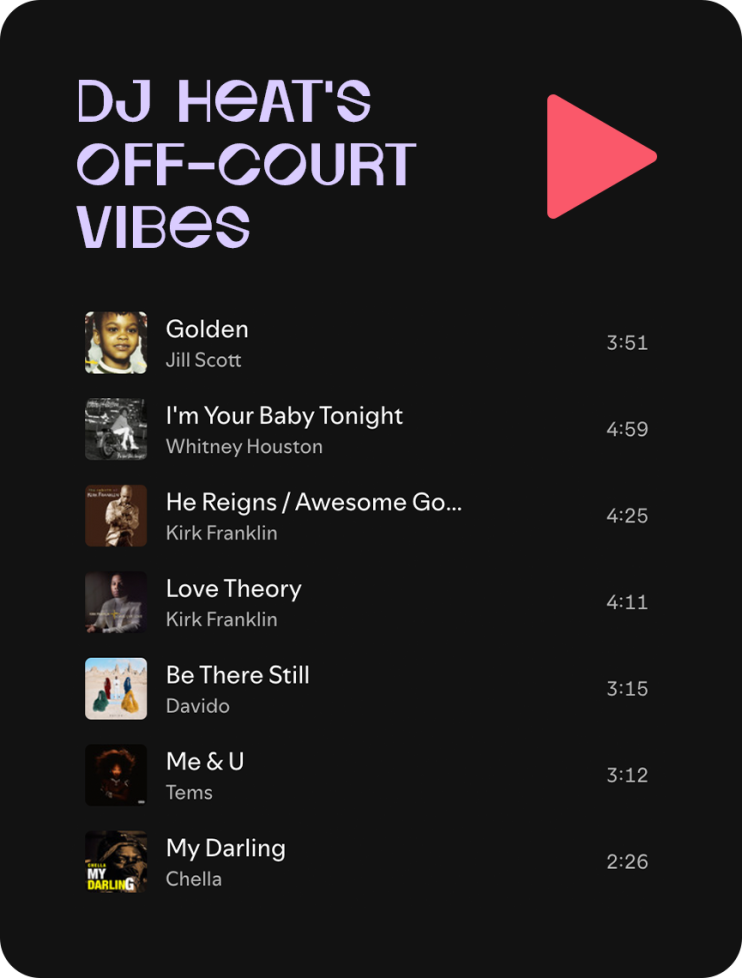 Listen to DJ Heat's "Off-Court Vibes" playlist. What you can find her listening to the most when she's not in game mode.